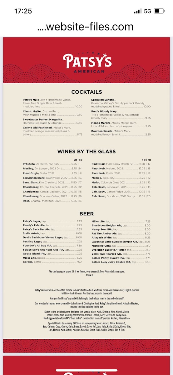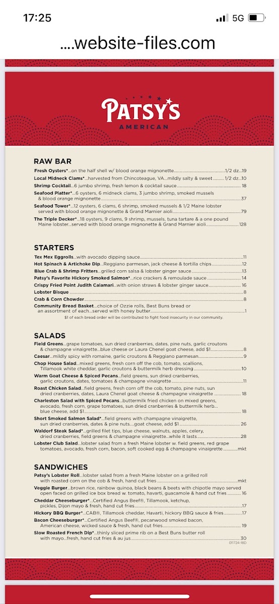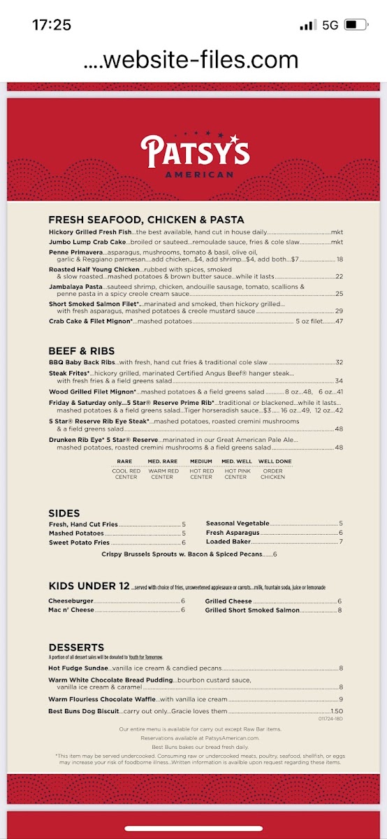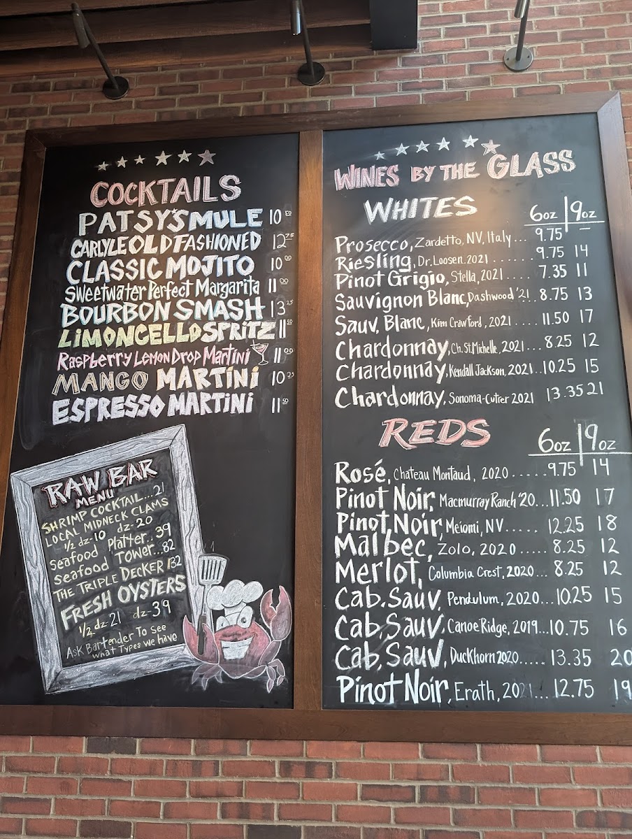 Patsy's American offers a refined take on classic American cuisine in a modern, upscale-casual setting. Located in Vienna, VA, this restaurant shines with its diverse menu that balances fresh seafood and hearty beef dishes. The Raw Bar impresses with fresh oysters served with blood orange mignonette and a generous seafood tower featuring clams, shrimp, smoked mussels, and half a Maine lobster. For meat lovers, the Beef & Ribs section is a standout, with options like the hickory-grilled Certified Angus Beef® hanger steak, wood-grilled filet mignon, and the uniquely marinated Drunken Rib Eye. Each dish is paired thoughtfully with sides like hand-cut fries or mashed potatoes, enhancing the dining experience.